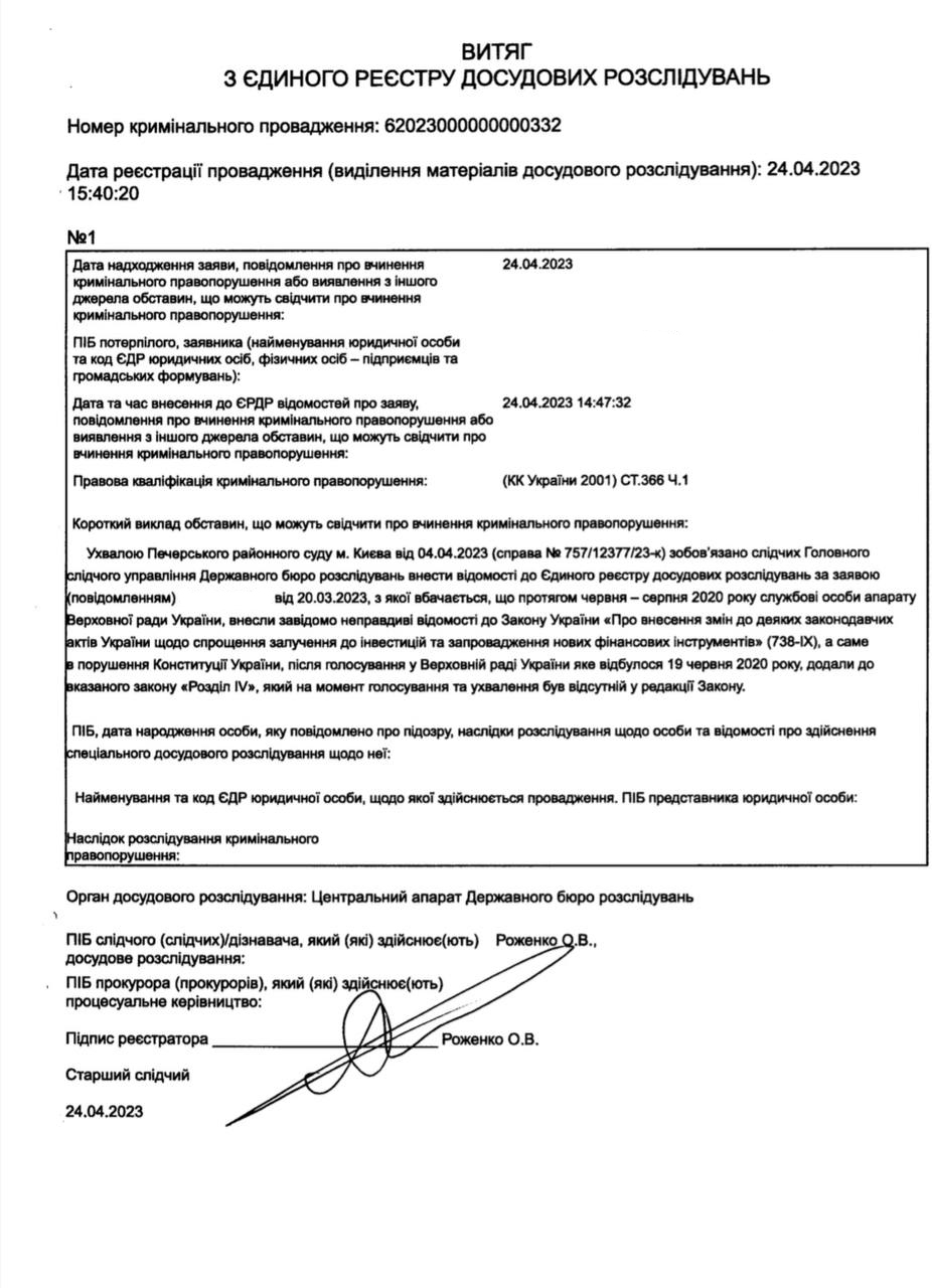 Печерський районний суд міста Києва своїм рішенням від 4 квітня зобов'язав Державне бюро розслідувань (ДБР) розпочати розслідування маніпуляцій апарату Верховної Ради, внаслідок яких у період ухвалення закону було змінено текст законопроекту. Йдеться про те, що вже після голосування до закону №738-ІХ «Про внесення змін до деяких законодавчих актів України щодо спрощення залучення інвестицій та запровадження нових фінансових інструментів», додали цілий розділ, про що раніше писало ZN.UA у матеріалі «Маргінальна Нацкомісія з цінних паперів, або «Як відлякати максимум інвесторів».