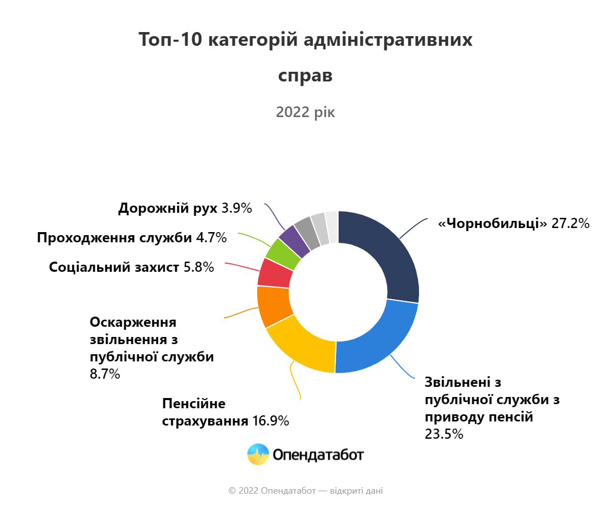В адміністративних судах найпопулярнішою категорією у 2022 році з великим відривом стали спори у сфері державного страхування "чорнобильців" — їх налічується більше 51 тисячі.
