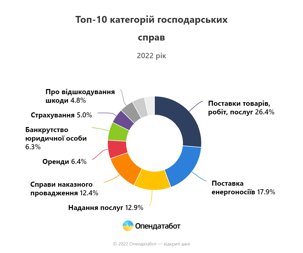 Перше та друге місця у господарських судах у 2022 році займали справи стосовно поставок робіт та послуг, а також щодо поставок енергоносіїв.