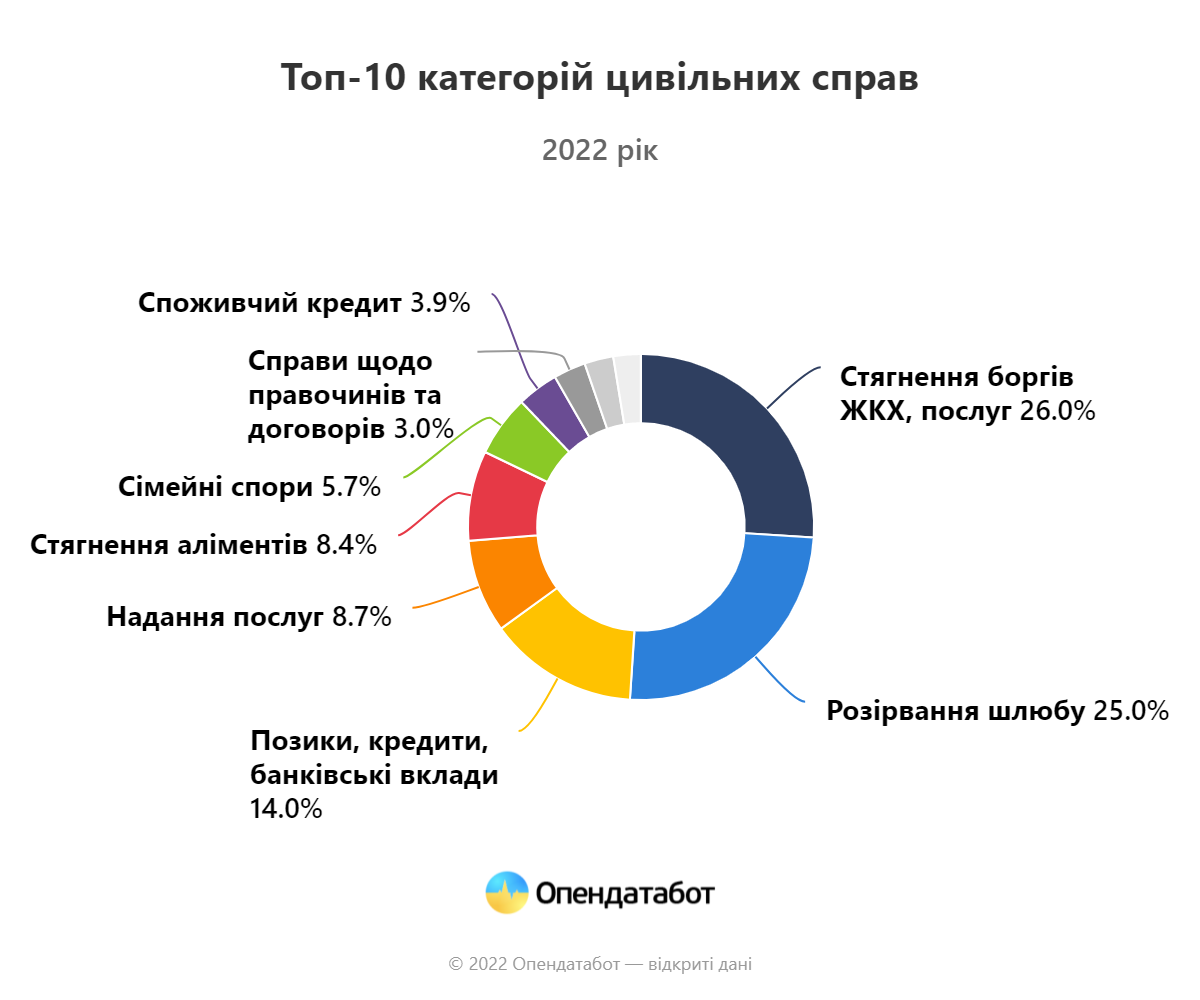 Крім того, у судах, що розглядають цивільні позови, лідерство тримали розлучення. Попри те, що кількість розлучень через РАГСи торік скоротилася на 40% (розлядають заяви про розлучення від бездітних пар та без майнових претензій), в судах справи про розірвання шлюбу та пов'язані з цим процеси у 2022 році були у топі — їх понад 50 тисяч.