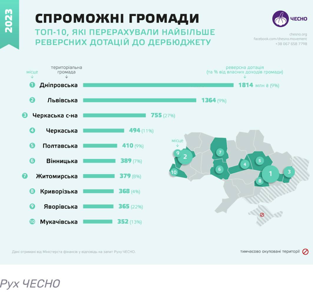 2023 року до переліку громад із найбільшими реверсними дотаціями потрапили Житомирська, Яворівська, Мукачівська міські громади та Черкаська селищна.