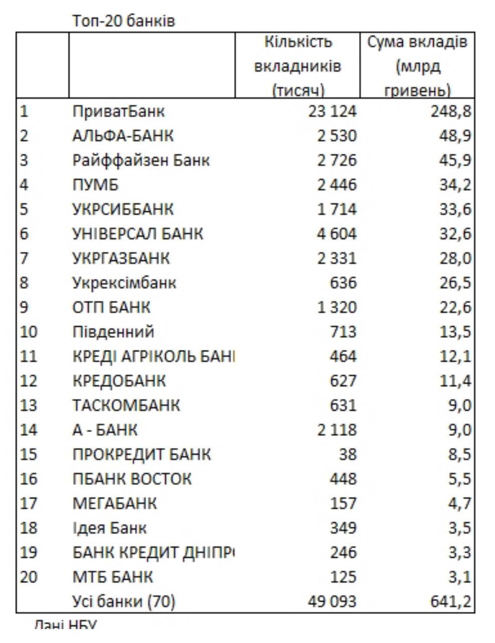 За оцінками НБУ, найбільше вкладів у державного Приватбанку – 248,8 млрд гривень, кількість вкладників – 23 млн 124 тисячі.