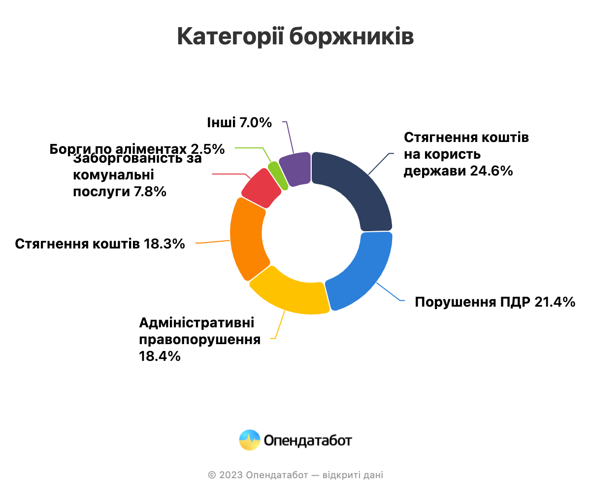 Майже чверть усіх боргів — 24,6% — складає стягнення коштів на користь держави. До лютого 2022 року кількість таких заборгованостей зросла лише на 2%.