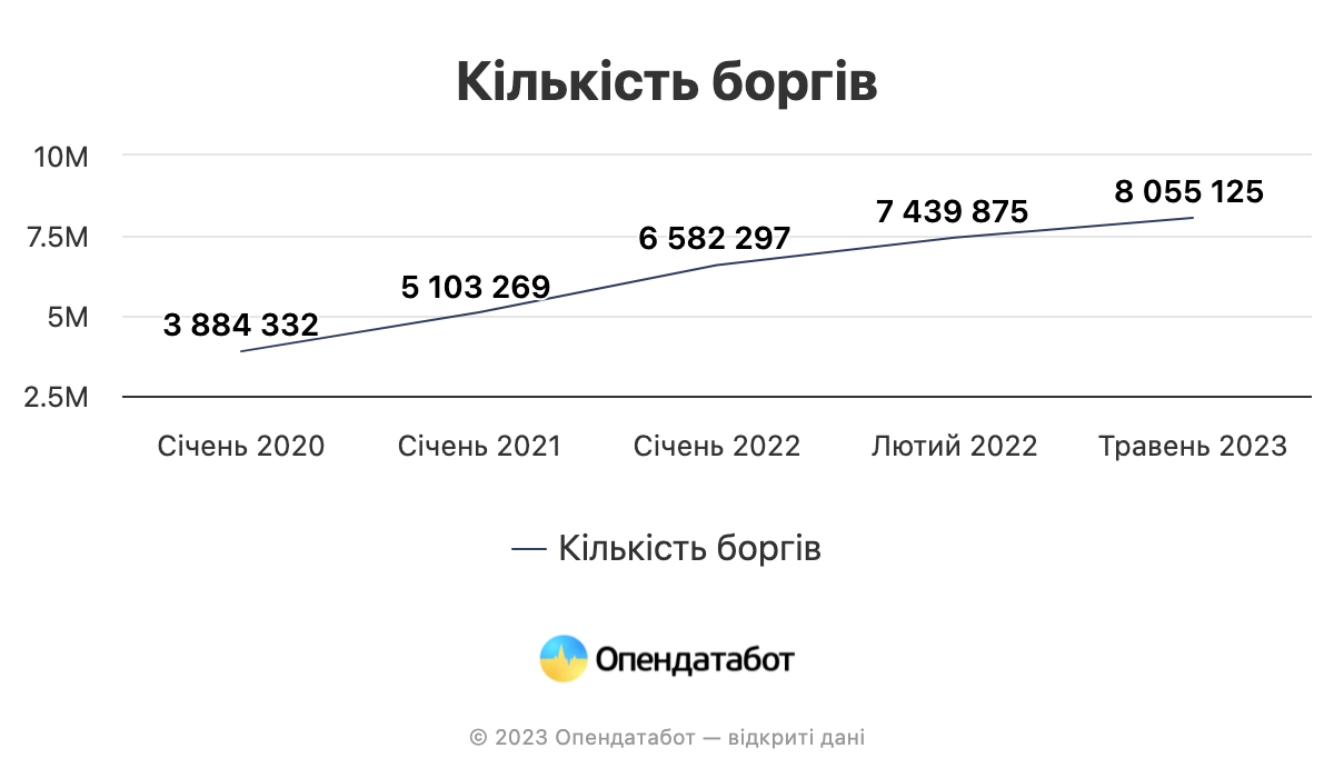 Так, у травні 2023 року чисельність боргів перетнула межу 8 млн, тоді як у лютому 2022-го їх нараховувалося 7,44 млн.