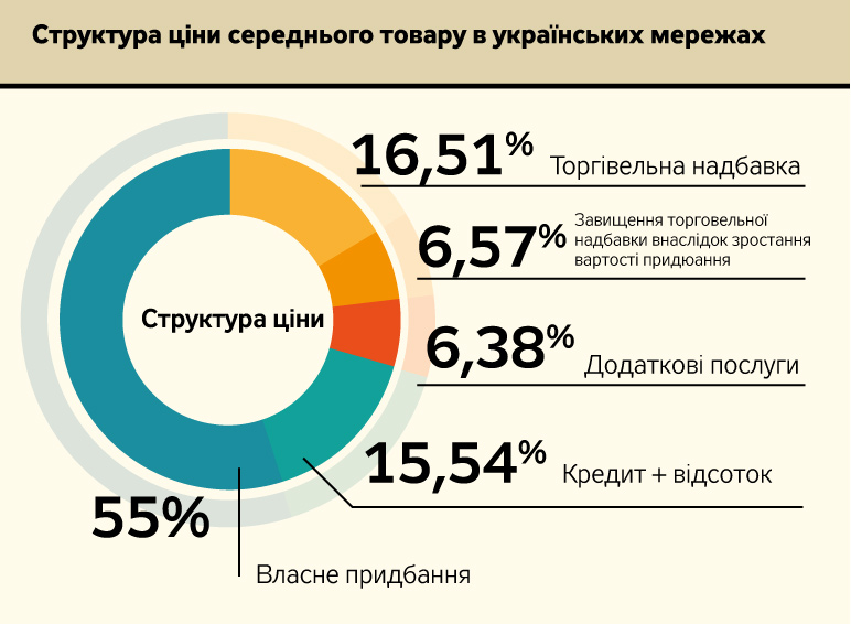 Нам кажуть: таким чинником стала неправдива статистика. Можливо, частково так, але ж не на стільки! Таким маховиком виявилися суб'єктивні чинники. Коли ми проаналізували структуру ціни на середній товар у торговельних мережах, то з'ясували, що 55% - це власне придбання товару, 15 - торговельна надбавка. А 30% - кошти, що отримують через можливість обмежувати конкуренцію і нав'язувати непотрібні додаткові послуги, суттєво затримувати платежі за вже реалізовані товари, контролювати ціни, за якими постачаються товари конкурентам, а також перекладати ризики своєї діяльності на постачальників. Поясніть мені, чому постачальник зобов'язаний сплачувати за прибирання магазину чи за внесення інформації про товар до електронних баз мережі, або ж за повернення вчасно нереалізованого товару?" - задається питанням в. о. голови АМКУ.