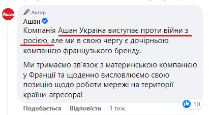 На сторінці компанії в Фейсбук в коментарі до одного з повідомлень зазначається, що "Ашан Україна" виступає проти війни з Росією.