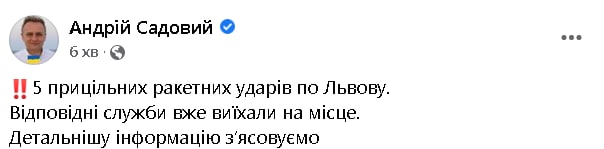 За словами Садового, у Львові тимчасово перекрили рух окремими вулицями. Триває ліквідація наслідків ракетних ударів. Всі служби працюють на місці.