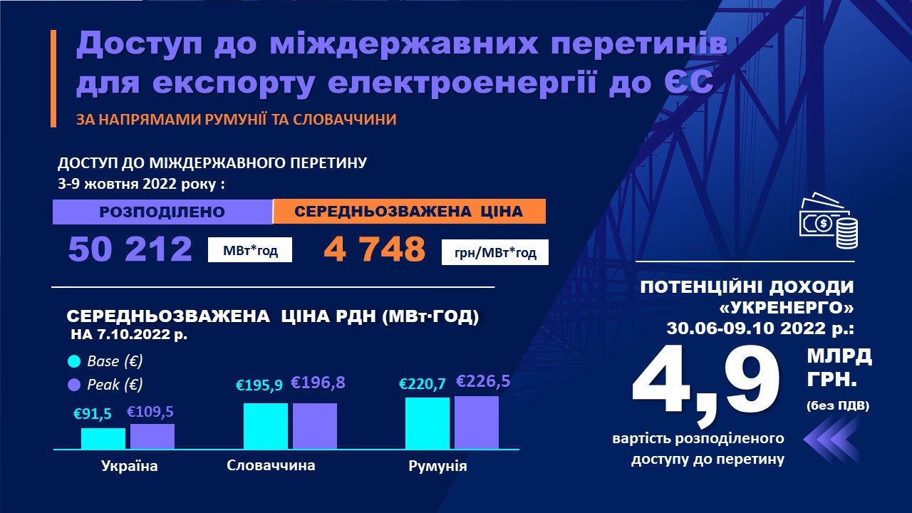 З 30 червня по 9 жовтня 2022 р «Укренерго» продала на аукціонах доступ до міждержавних електромереж в напрямку Словаччини🇸🇰 та Румунії на понад 4,9 млрд гривень. Про це повідомляють в «Укренерго».