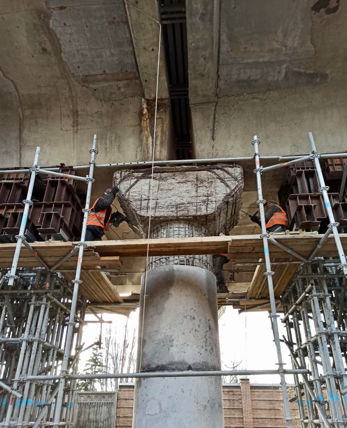 З основних несних конструкцій, будівельники знімають захисний шар бетону. Це потрібно, щоб надалі посилити опори додатковим армованим каркасом. Після армування, за сприятливих погодних умов, виконають бетонування. А щоб вода не пошкоджувала конструкції, додатково нанесуть полімеризований захисний шар покриття.