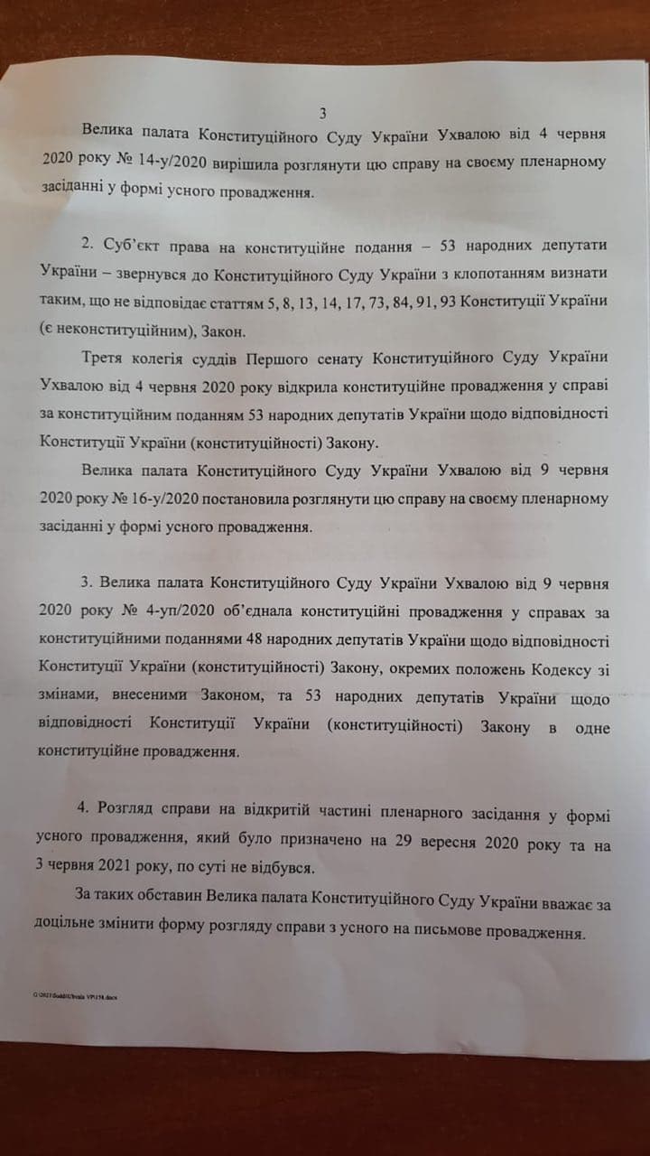 28 травня та 4 червня 2020 року КСУ відкрив провадження за цими поданнями, згодом об’єднавши в одне провадження, а потім визначився з формою розгляду справи за кожним з цих подань – ухвалами Великої палати КСУ від 4 та 9 червня того ж року було постановлено в обох випадках здійснити розгляд справи у відкритій формі за участю представників суб’єкта права на конституційне подання, Верховної ради та президента.
