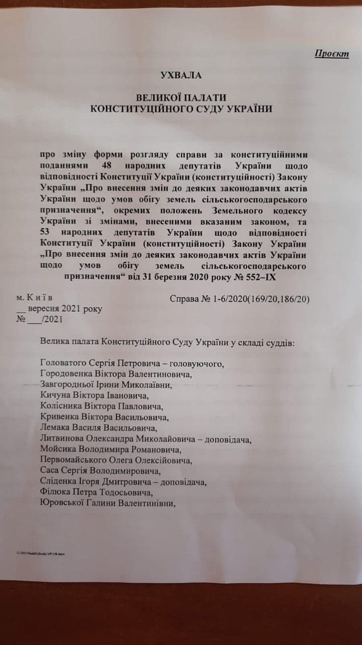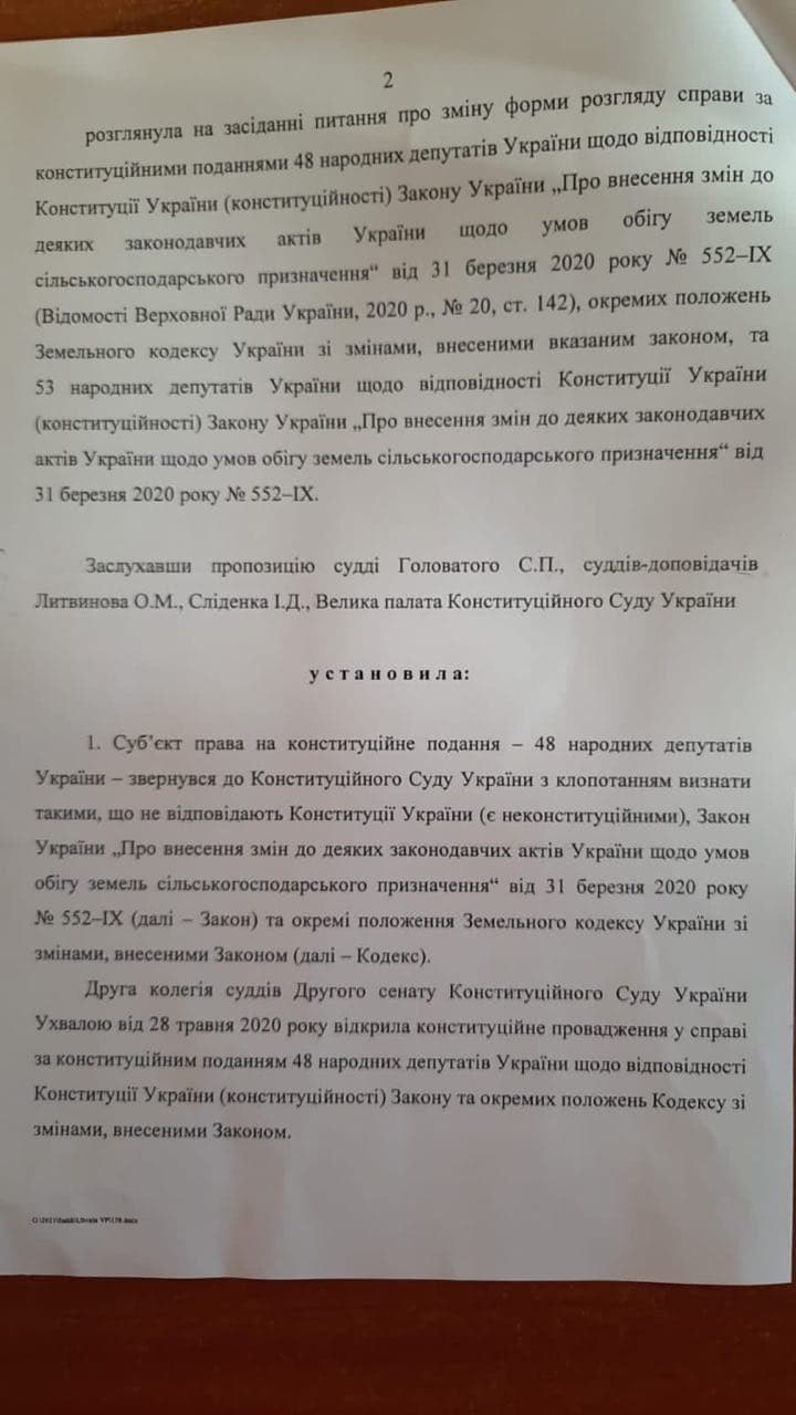 Йдеться про справу щодо встановлення відповідності Конституції України (конституційності) тих законів, якими з 1 липня цього року запроваджено земельну реформу, зокрема в частині умов обігу (купівлі-продажу) земель сільськогосподарського призначення: ЗУ «Про внесення змін до деяких законодавчих актів України щодо умов обігу земель сільськогосподарського призначення» від 31 березня 2020 року та окремих положень Земельного кодексу України.