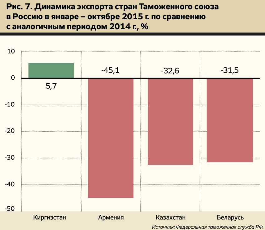 У Вірменії падіння склало 45,1%, в Казахстану – на 32,6%, у Білорусі – на 31,5%. Це при тому, що Білорусь і Казахстан користувалися вигідним становищем і експортували в Росію заборонені нею товари з Європи, переклеюючи етикетки. Лише Киргизстану вдалося збільшити свій експорт на ринок РФ на 5,7%.