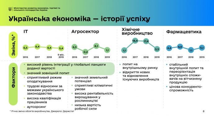 За оцінками Мінекономіки, найуспішніші сфери української економіки: IT-сектор, аграрный сектор, хімічне виробництво і фармацевтика. Про це повідомив міністр економіки Тимофій Милованов під час презентації програми "Економічна стратегія: зростання через інвестиції", пише ЕП.