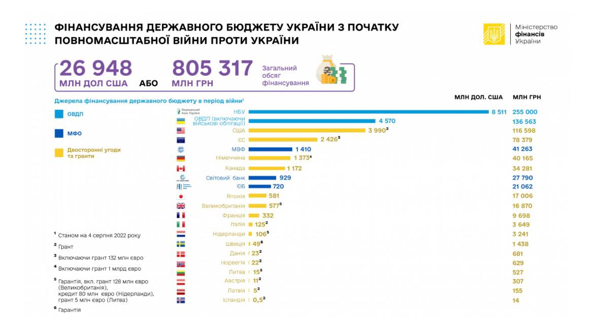 На потреби держбюджету України з початку війни було направлено 805,3 млрд. гривень або 26,95 млрд. доларів. При цьому зовнішні надходження (13,87 млрд доларів) становили трохи більше половини (51%) від загального розміру фінансування. Про це повідомляє прес-служба Мінфіну.