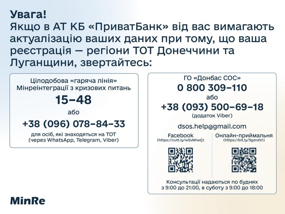 У Мінреінтеграції звернулися до Нацбанку зі скаргою на дії Приватбанку, який нібито блокує рахунки клієнтів, які мешкають на тимчасово окупованих територіях, якщо вони не можуть актуалізувати свої персональні дані. З подібними наріканнями на дії Приватбанку до Мінреінтеграції звернулися мешканці Херсонської, Запорізької та тимчасово окупованих Луганської та Донецької областей.