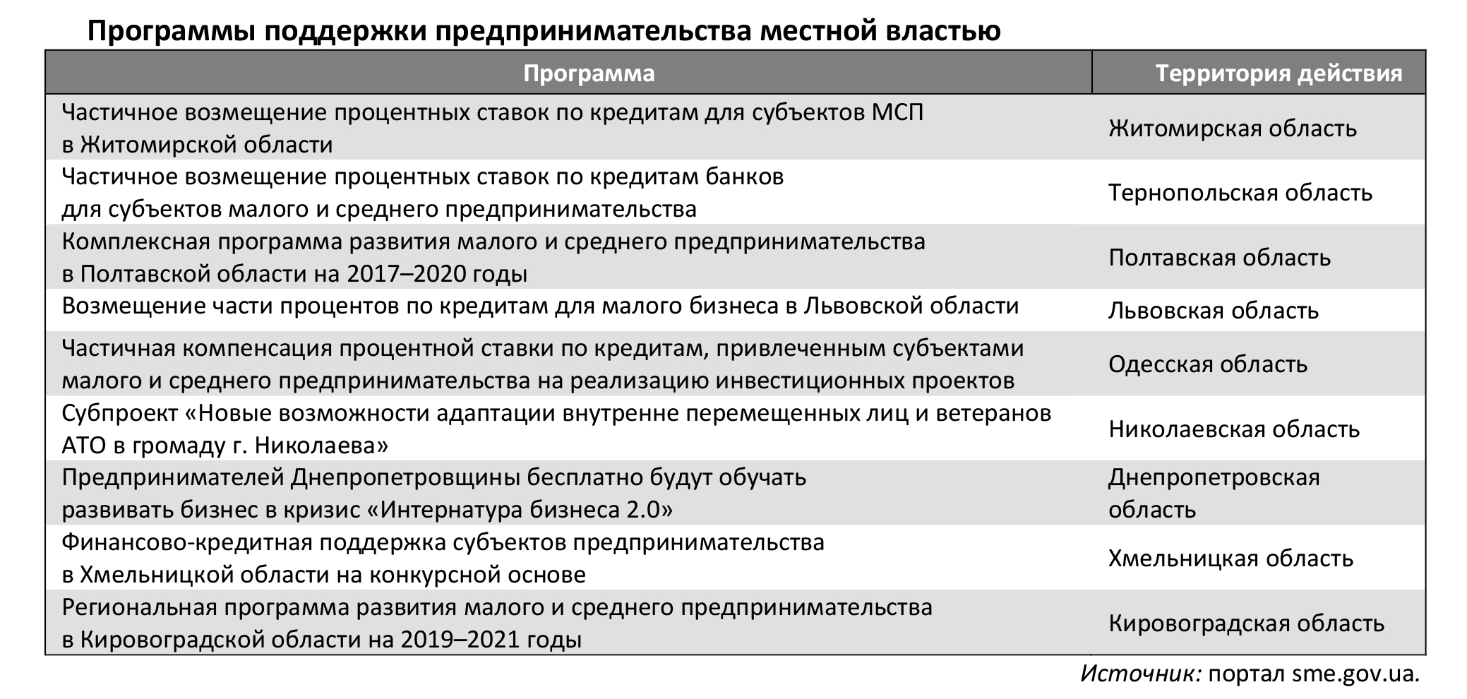 Місцева влада не може допомагати бізнесу грошима, навіть за допомогою кредитування. Однак Бюджетний кодекс України дозволяє приймати місцеві цільові програми, на основі яких формуються бюджетні програми підтримки бізнесу.