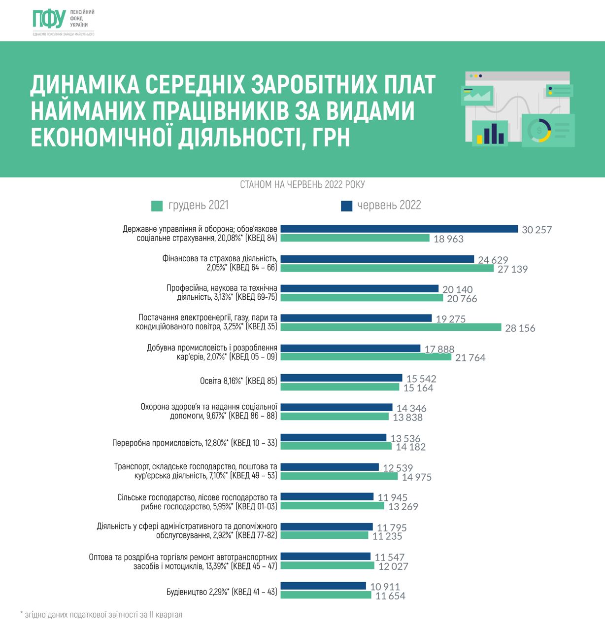 Про це йдеться в оприлюдненому Пенсійним фондом України «Розподілі чисельності застрахованих осіб та динаміка середніх заробітних плат найманих працівників за видами економічної діяльності станом на червень 2022 року (згідно даних звітності платників за II квартал)»