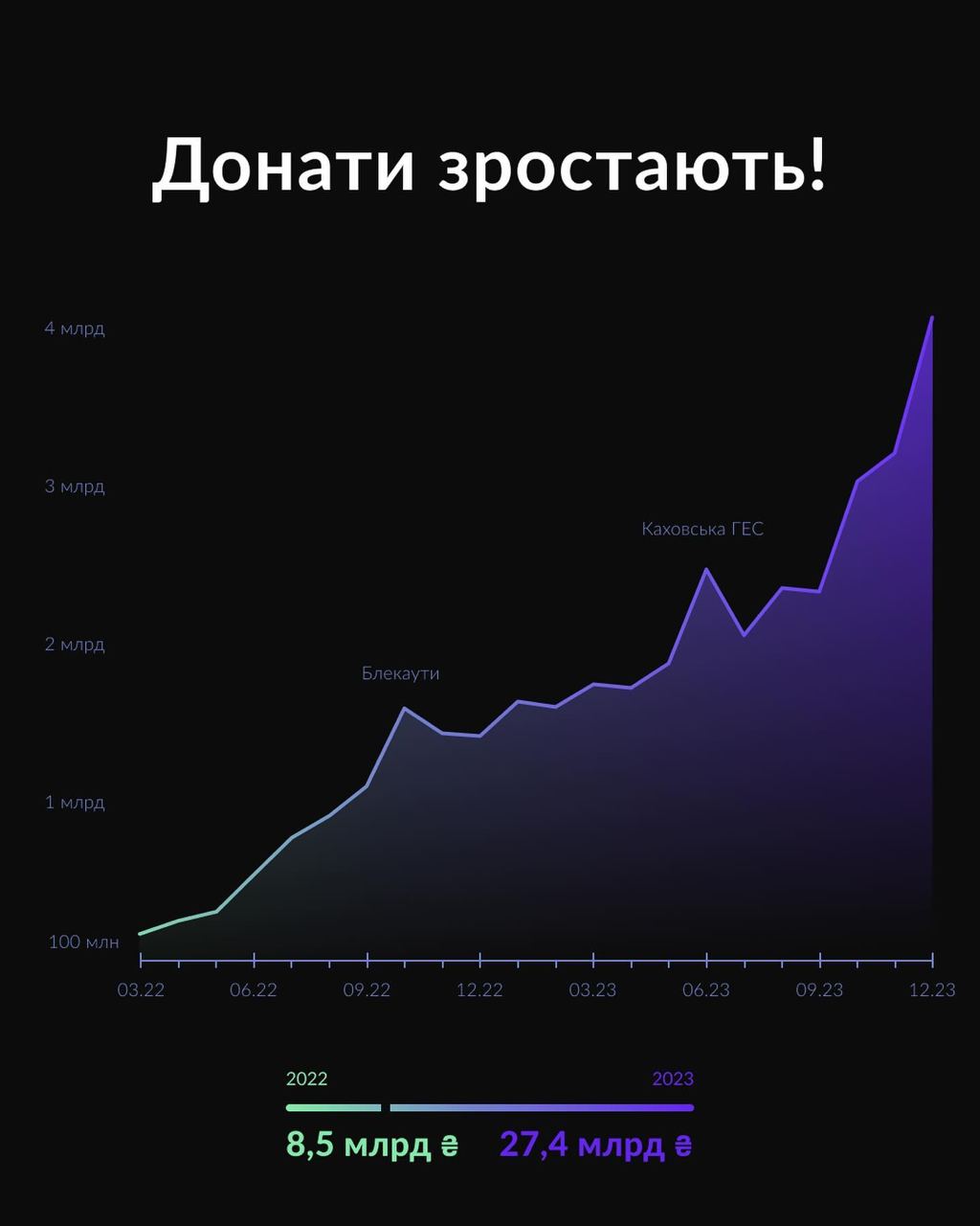 «Українці задонатили за 2023 рік утричі більше ніж за 2022, – статистика Monobank. 27,4 млрд грн (торік – 8,5 млрд). Кількість бажаючих долучитися зросла на 2,7 млн. Середній донат склав 349 грн, а торік був 258 грн», - вказано в повідомленні Telegram-каналу Труха Украина.