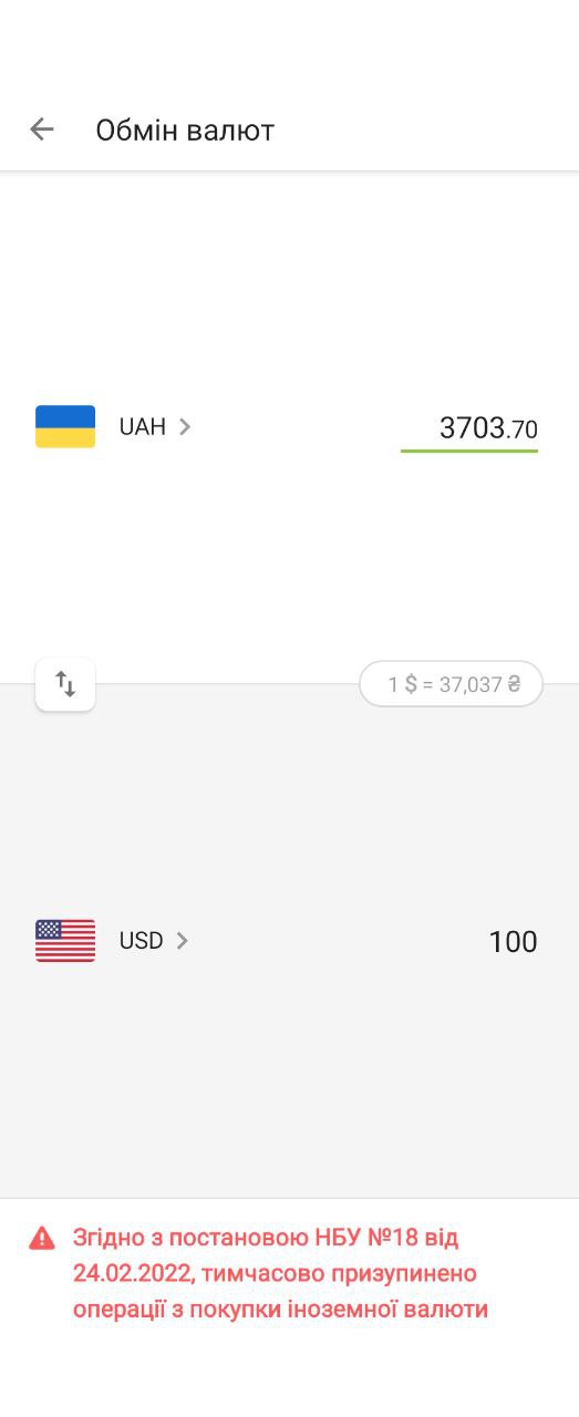 Банки могли продавати населенню валюти рівно стільки, скільки її в нього купили, тож знайти долари чи євро в касах банків вдавалося не завжди. Безготівкові операції з купівлі валюти, зокрема через застосунки, були заборонені.