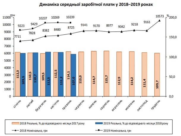 Реальна зарплата в травні 2019 року до травня минулого року зросла на 7,0%. Найвищі зарплати зафіксовані в Києві - 15157 грн, найнижча - у Чернівецькій області - 7819 грн. Найнижчі зарплати, за даними Держстату, у сфері охорони здоров'я і соцдопомоги - 6915 грн. Найвищі зарплати отримують працівники сфери фінансів і страхування - 18888 грн.