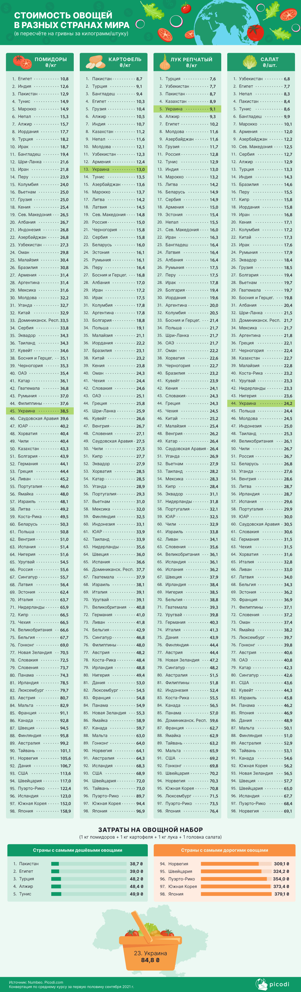 Придбати умовний овочевий кошик з продуктами, розглянутими в даному дослідженні, найвигідніше в Пакистані (38,7 ₴), Єгипті (39 ₴) і Туреччини (48,2 ₴). За овочевий набір в Україні доведеться заплатити 84,8 ₴. В Японії набір коштує в 4,5 раза дорожче — 379,1 ₴.