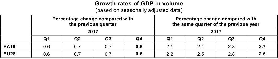 За підсумками всього 2017 року ВВП країн єврозони збільшився на 2,5%, що є найвищими темпами зростання з 2007 року, тобто до фінансової кризи.