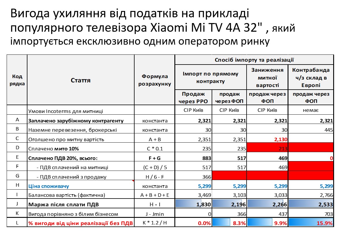 Експерт проілюстрував свої слова розрахунками, де продемонстрував на конкретних цифрах переваги, які отримує недобросовісний продавець що реалізовує продукцію, як імпортовану в «білу», так і завезену контрабандою або за заниженою митною вартістю. Прикладом того, яка вигода може бути при контрабандному імпорті й продажі через неплатника ПДВ без фіскального чеку, послугувала популярна модель LED телевізора з діагоналлю 32” з Smart модулем, що дистрибутується ексклюзивно одним оператором ринку.