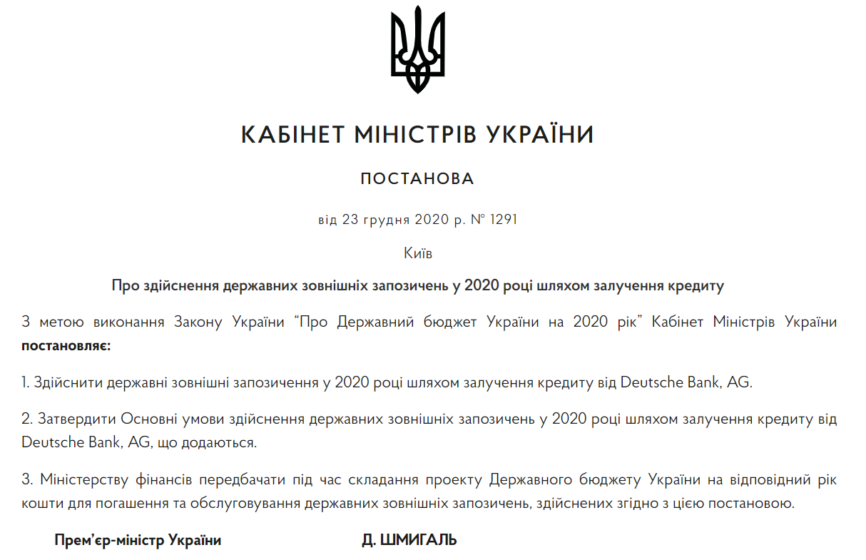 До кінця 2020 року Україна залучить короткостроковий кредит від Deutsche Bank на суму до $350 млн.