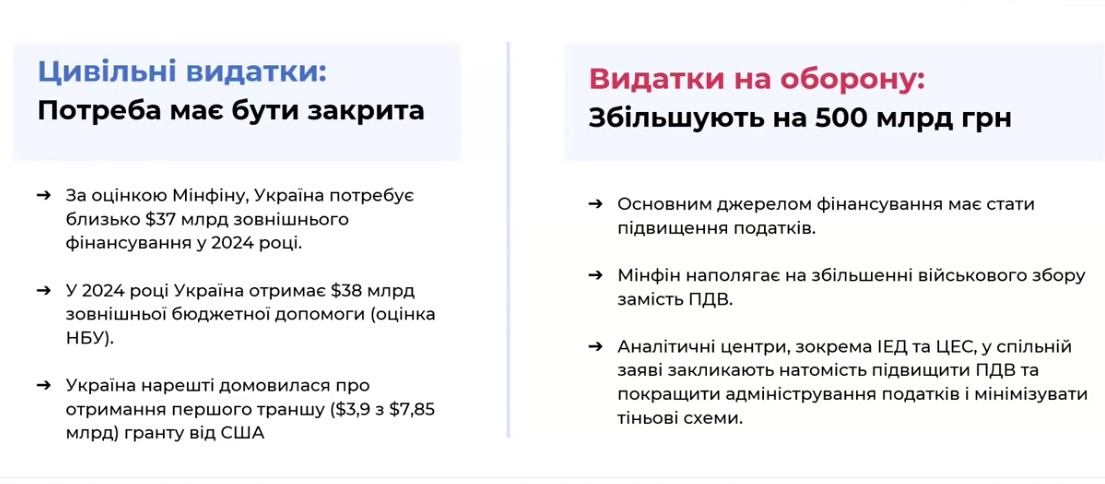 Як повідомлялось раніше, міністр фінансів Сергій Марченко зазначив, що Україна на наступний рік має непокриту потребу від 12 до 15 мільярдів доларів. При цьому “діру” у 5 мільярдів доларів уряд повинен закрити самотужки, як варіант, збільшивши податки. За словами міністра, через затримки з виділенням пакетів оборонної допомоги від партнерів уряд уже почав витрачати на закупівлю зброї кошти, закладені для виплат грошового забезпечення військових наприкінці року. Саме тому під кінець року в бюджеті оборони виникне фінансовий розрив.