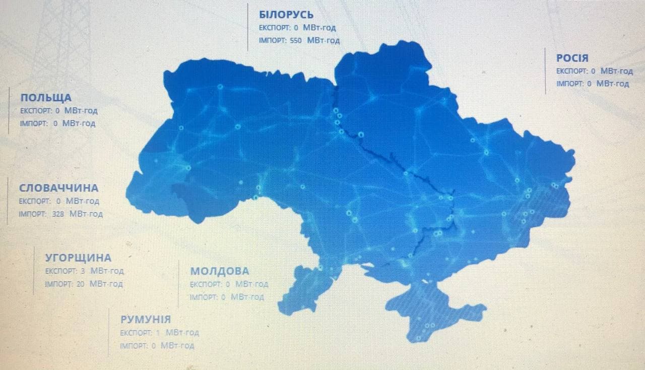 Відзначається, що всього в ОЕС України в п'ятницю імпортували 1512 МВт-год електроенергії. Зокрема, з Білорусі - 452 МВт-год, Словачина - 328 МВт-год, Угорщини - 20 МВт-год.