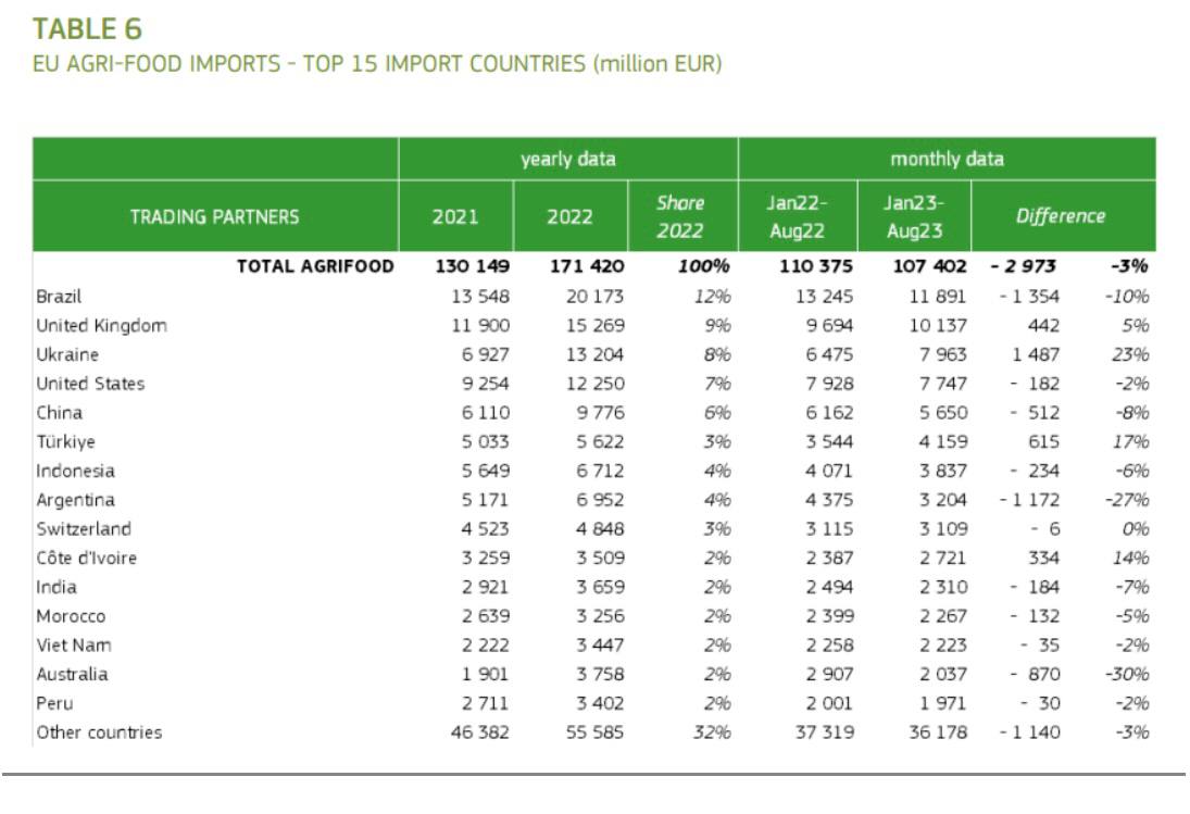 Одна намітилась негативна тенденція для всіх імпортерів АПК. Імпорт до ЄС зріс до місячного показника у 5% у серпні 2023 року, та досяг 12,5 млрд євро, що на 15% менше за рівень серпня 2022 року.