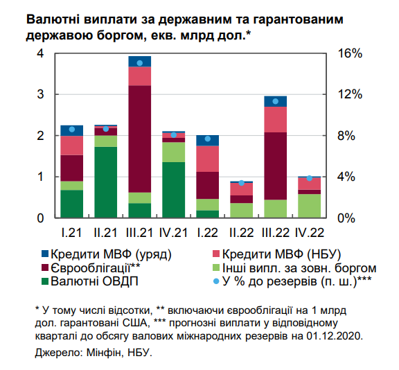При цьому в 2021 році Україна повинна погасити $10 млрд зовнішніх боргів, у 2022 - $7 млрд. Пік виплат припаде на третій квартал 2021 року - близько $4 млрд.