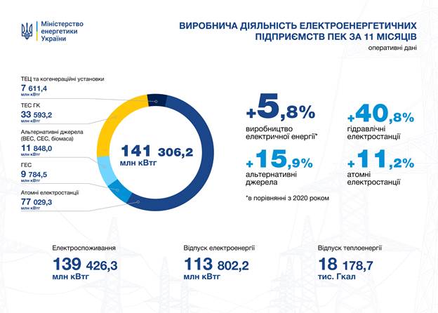 Основну частку у загальному виробництві електроенергії за 11 місяців 2021 року займають АЕС – 54,5%. Частка ТЕС та ТЕЦ склала 29,2%, ГЕС та ГАЕС – 6,9%. Частка виробництва електроенергії із відновлюваних джерел становить 8,4%.
