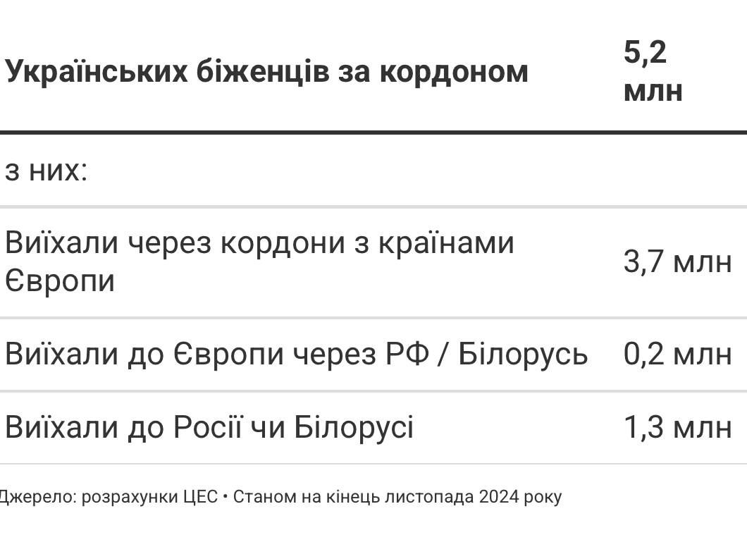 Станом на листопад 2024 року за кордоном через війну Росії в Україні перебувало 5,2 млн українців. Це на 300 тис. осіб більше, ніж було у січні 2024 року. Про це свідчать результати дослідження дослідницькою агенцією Info Sapiens на замовлення Центру економічної стратегії.
