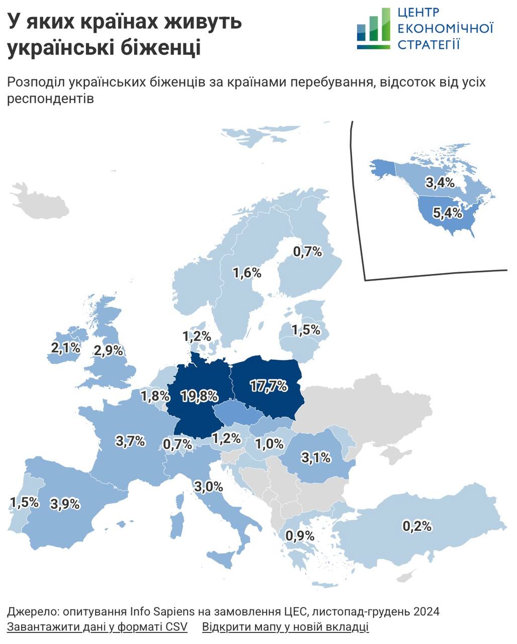 Відповідно до аналізу отриманих данних, більшість українських біженців за кордоном перебувають у Німеччині (20%) та Польщі (18%). У Сполучених Штатах Америки перебуває 5,4% усіх біженців, але загалом разом з Канадою ці дві країни прийняли менше 10% біженців — основний тягар несуть країни Європи.