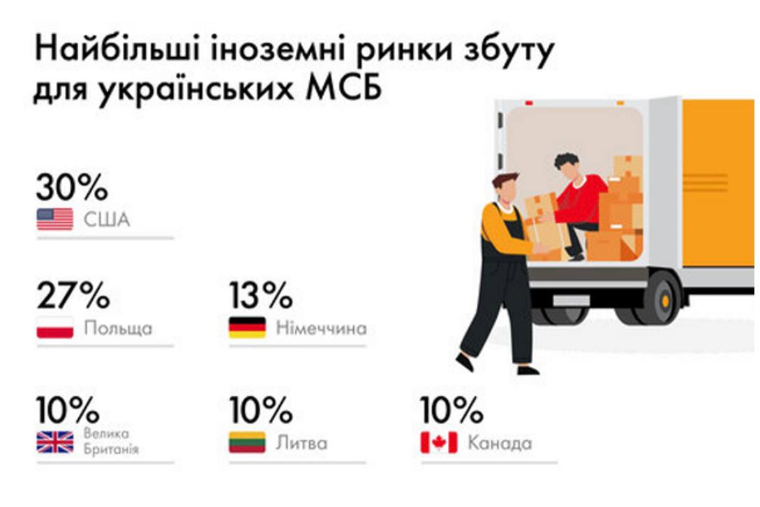 Ще 21% планують розпочати це робити у майбутньому. При цьому найбільше вони продають свої товари та послуги на ринки США (30%), Польщі (27%), Німеччині (13%), Великій Британії (10%), Литви (10%) та Канади (10%).