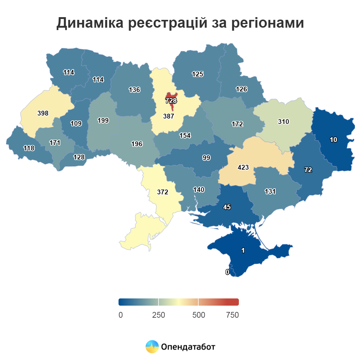 Регіонально визначилися три лідери реєстрації – Київ, Дніпропетровська та Харківська області. Інфографіка показує динаміку реєстрації ФОПів в цілому по Україні з іншими видами реєстрації.