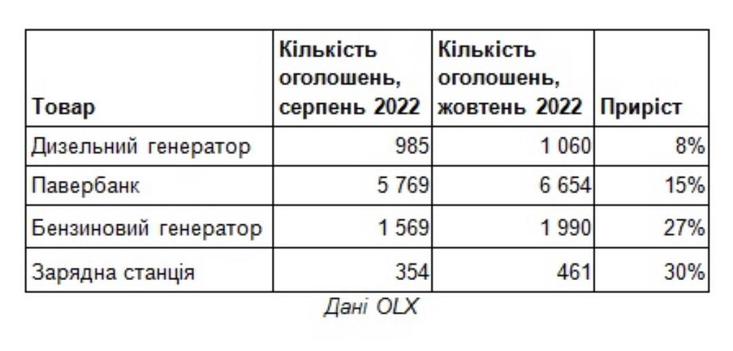 Портативна зарядна станція – наприклад, на 210 Вт-год із середньою вартістю 15 500 грн. зможе тричі підзарядити ноутбук, більше 10 разів – телефон, а також підтримати роботу холодильника до 3 годин. Для телефонів та ноутбуків не зайвим буде павербанк від 20 000 mAh, його середня ціна на OLX у жовтні складає 1300 грн.