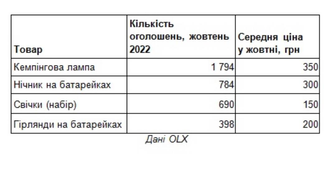 Якщо в будинку зникне електроенергія, знадобиться не лише ліхтарик із запасними батареями. Альтернативою можуть бути будь-які гірлянди чи нічники на батарейках, свічки та кемпінгові ліхтарі. Ціни з серпня по жовтень не змінилися, а кількість оголошень з продажу гірлянд та свічок збільшилася на 12% та 28% відповідно.