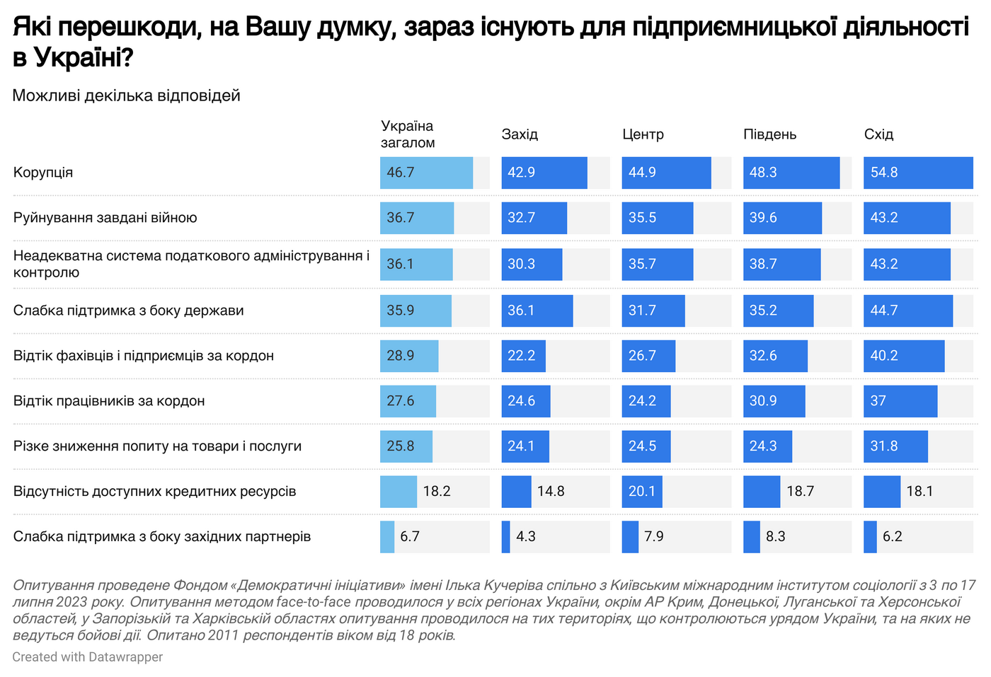 Серед перешкод для бізнесу корупцію трохи частіше називали на сході України, рідше – на заході. Схожа тенденція щодо критичного ставлення до податкового контролю. Представники більш постраждалих через бойові дії східних і південних регіонів частіше згадували про відтік фахівців і підприємців за кордон, а також про відтік працівників.