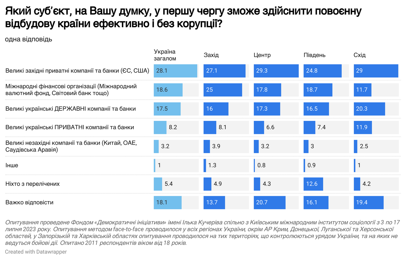 Найменше люди вірять, що великі незахідні компанії та банки (наприклад, з держав Азії) у першу чергу зможуть відновлювати Україну ефективно та без корупції. Довіра лише від приблизно 3% респондентів.