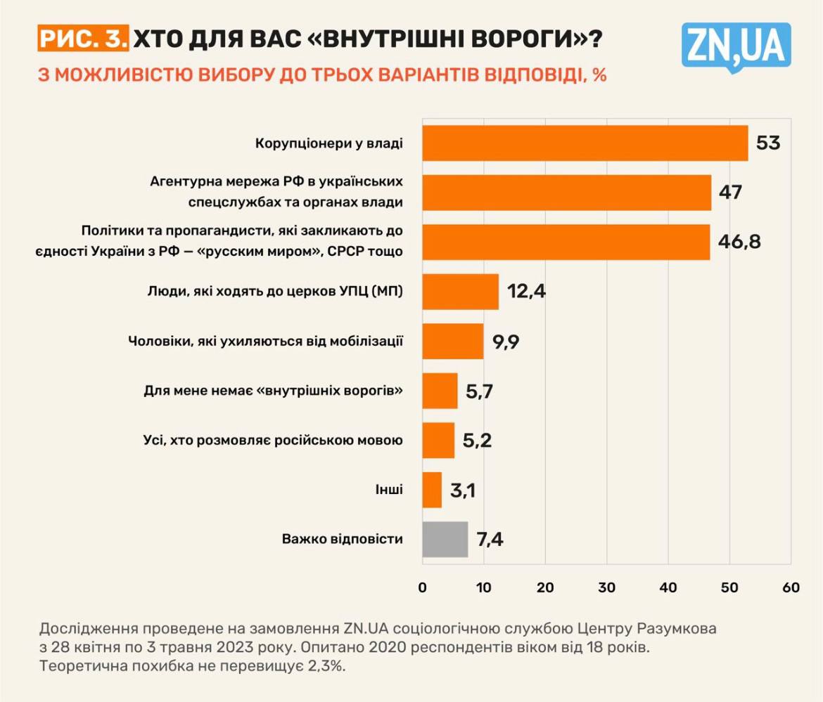 Варіант «Політики та пропагандисти, які закликають до єдності України з Росією — «русским миром», СРСР, Російською імперією» — 46,8%. У респондентів була можливість обрати три варіанти зі дев’яти, але і за цієї умови корупціонери «перемогли».