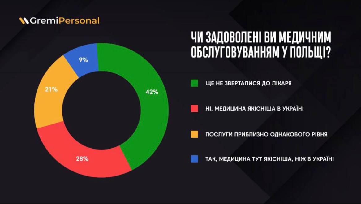 Крім того, до 21% опитаних українців вказали, що медичні послуги у двох країнах приблизно на одному рівні, 9% вважають, що польська медицина краща за українську. Однак по медичні послуги за весь період війни не зверталися 42% опитаних.