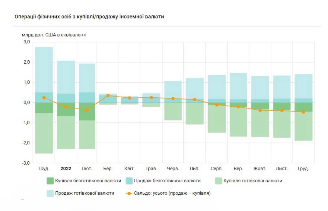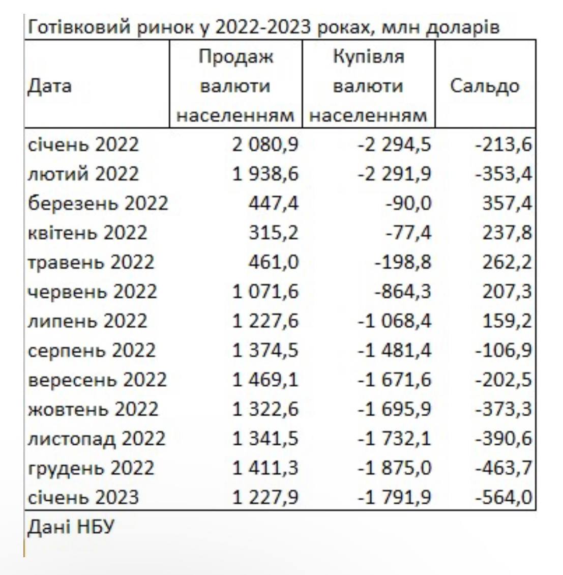 Дані показують, що більше половини попиту (370,5 млн доларів) у січні 2023 року припало на безготівкову валюту, яку українці купують у банках за курсом, близьким до офіційного (36,6 гривень), тоді як на готівковому ринку курс коливається близько рівня 40,5 гривні за долар.
