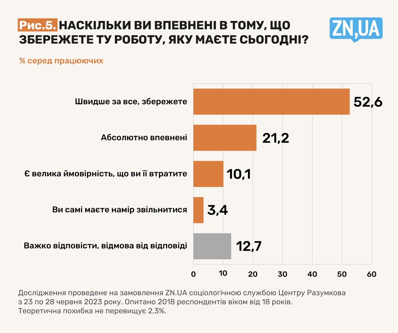 Відповідаючи на питання «Наскільки ви впевнені в тому, що збережете ту роботу, яку маєте сьогодні?», більше половини (52,6%) працюючих обрали відповідь «швидше за все», а ще 21,2% абсолютно впевнені, що так воно і буде. Нечуваний оптимізм, зважаючи на хронічну для нашого суспільства «роботу не за спеціальністю». Про це пише Юлія Самаєва, редакторка економіки ZN.UA, у матеріалі «Сімом з десяти українців при пошуку нової роботи довелося змінювати кваліфікацію. Чи вивчимо ми цей урок?»