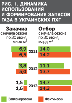 Для порівняння, закачування газу в ПСГ з початку сезону по 30 червня за фактом становила: у 2011 році 6,5 млрд куб. м при плані в 6,9 млрд. куб. м, в 2012 році - 5,0 млрд куб. при плані 3,8 млрд куб. м, у поточному 2013 році - 1,6 млрд куб. м при плані 1,5 млрд кубометрів.