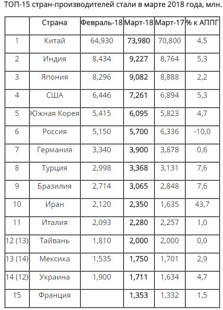 Повідомлялося, що за підсумками вересня 2017 року Україна опустилася з 11-го на 13-е місце в рейтингу виробників сталі.