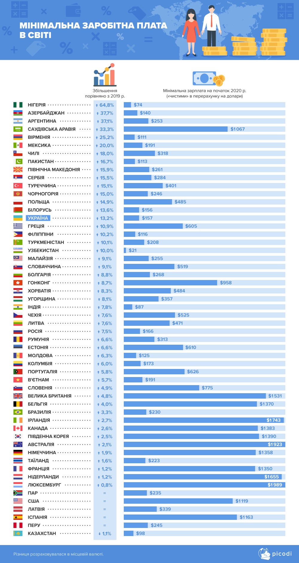 З початку року мінімальна заробітна плата в Україні зросла на 13,2% до $ 157. Як результат, у світовому рейтингу зростання мінімальних зарплат Україна посіла 15-е місце з 54-х країн. Про це йдеться в рейтингу міжнародної платформи електронної комерції Picodi.com "Мінімальна зарплата в світі".
