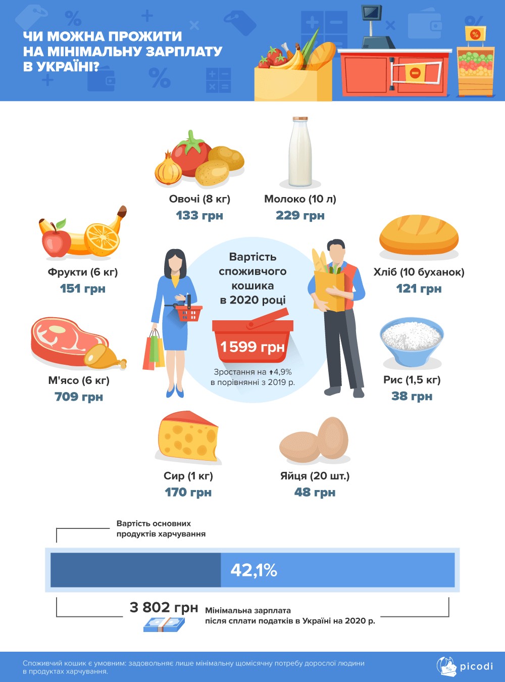 При цьому аналітики порівняли ціни на продукти харчування з мінімальною зарплатою. Продовольча кошик складається з 8 позицій: хліб, молоко, яйця, рис, сир, м'ясо, фрукти і овочі – ці продукти задовольняють мінімальну потребу дорослої людини в поживних речовинах.
