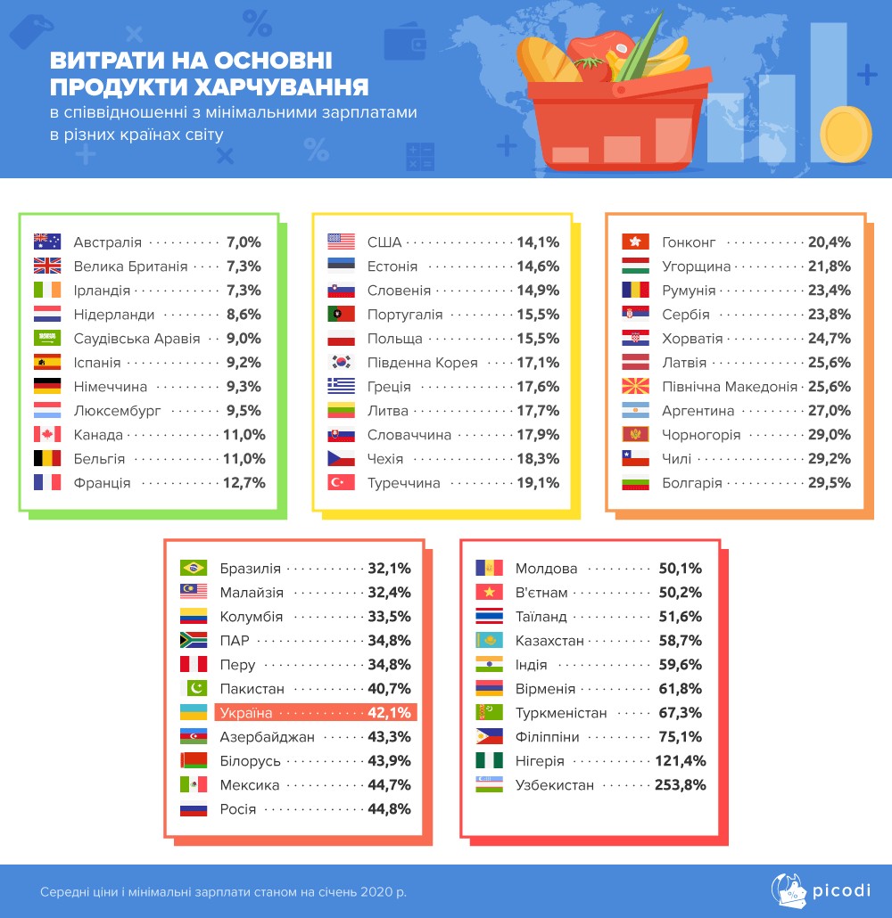 В цьому рейтингу Україна посіла 40 місце. Саме вигідне співвідношення цін на продукти до мінімальної зарплати у Австралії, Великобританії та Ірландії. Там продуктовий кошик становить від 7 до 7,3% від місцевої мінімальної оплати праці. Позаду України в цьому рейтингу розташувалися Білорусь (42 місце), Росія (44 місце) і Молдова (45 місце). У деяких країнах, таких як Китай і Узбекистан, мінімальна зарплата не перевищує вартості самого скромного набору продуктів.